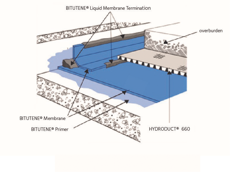 - Conduct the flood test 24-hours after completing the application of BITUTHENE waterproofing system. Immediately after flood test is completed, and all necessary repairs made, install drainage composite to protect the BITUTHENE membrane from traffic and other trades.